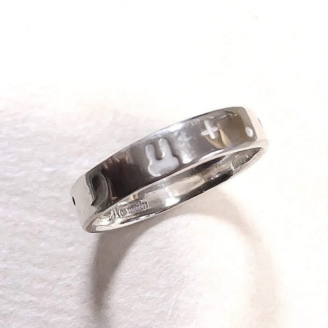 オーダーメイド作品。 うさぎや月、星などの刻印を入れたシルバーリングです。 素材:silver950 形状:flat デザイン:stamp サイズ:10号 幅:約4.0mm 厚み:約1.2mm